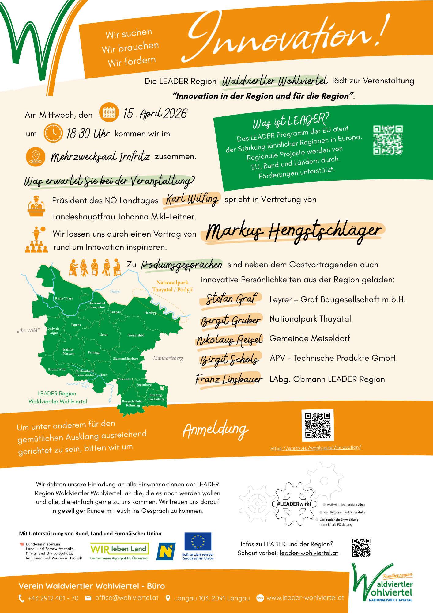 Wir richten unsere Einladung an alle Einwohner:innen der LEADER Region Waldviertler Wohlviertel, an die, die es noch werden wollen und alle, die einfach gerne zu uns kommen. Wir freuen uns schon sehr auf einen spannenden Austausch auf der Bühne und in geselliger Runde nach der Veranstaltung!
